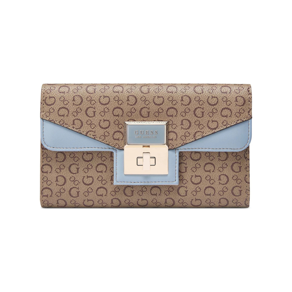The Guess Moonstone SLG is a stylish and functional accessory, with a spacious interior and adjustable shoulder strap for easy carrying. The light brown color and nickel hardware give it a sophisticated look, while the plain PVC material ensures durability. Add a touch of elegance with the multi-colored handle. Dimensions: 19cm x 11cm x 2cm.